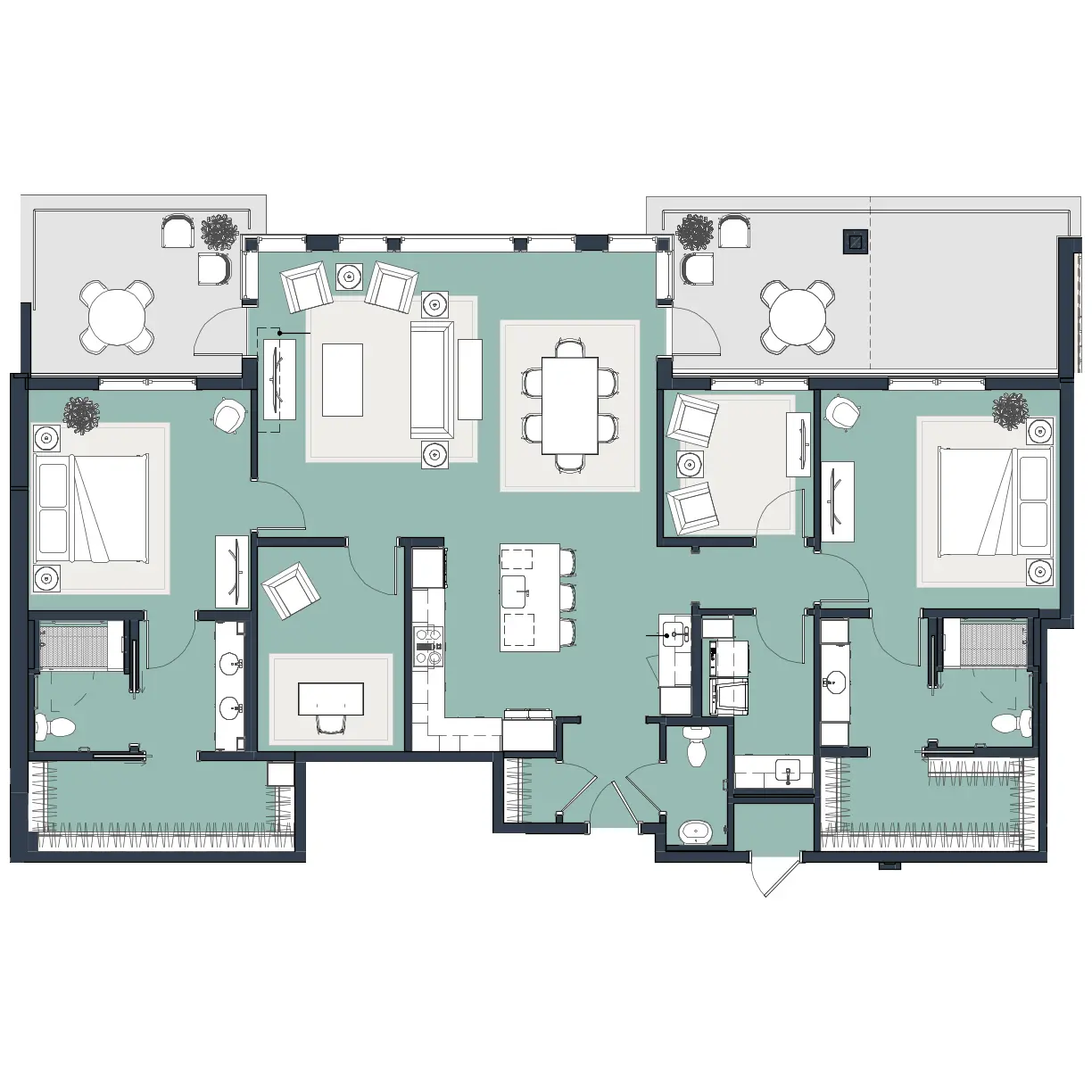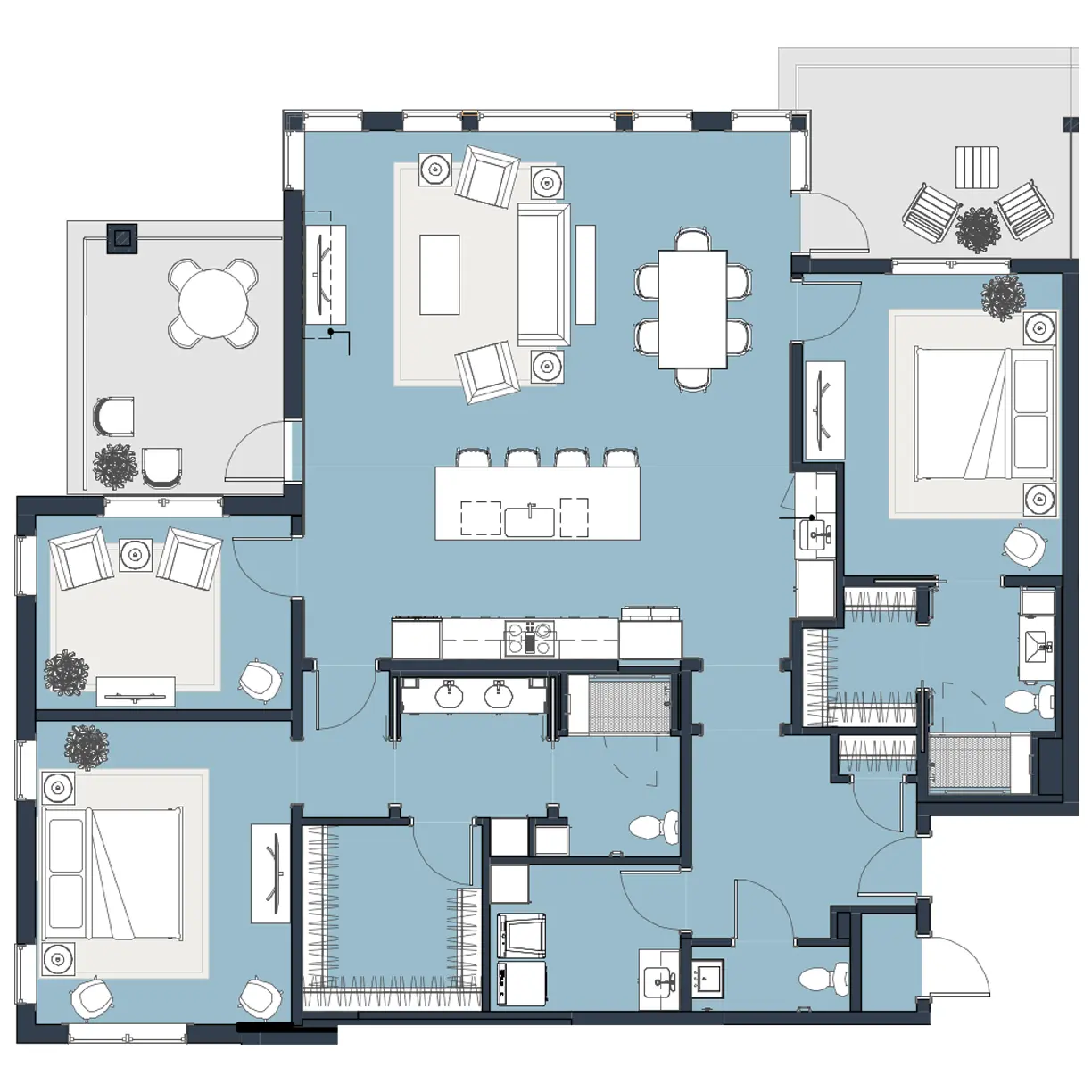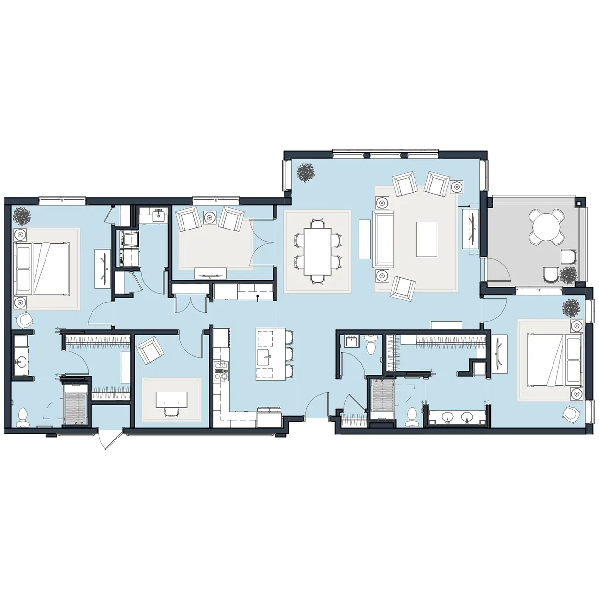The apartments will range from 1,733 to 2,081 square feet. Each apartment includes two bedrooms, two-and-a-half bathrooms, an eat-in kitchen, a living/dining room, a den or study, a laundry room, and a covered porch or balcony.